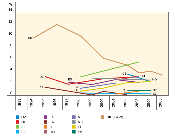 For younger adults, the EMCDDA uses the range 15 to 24 years (Denmark and UK from 16, Germany, Estonia (1998), Ireland (1998) and, the Czech Republic and Hungary from 18).